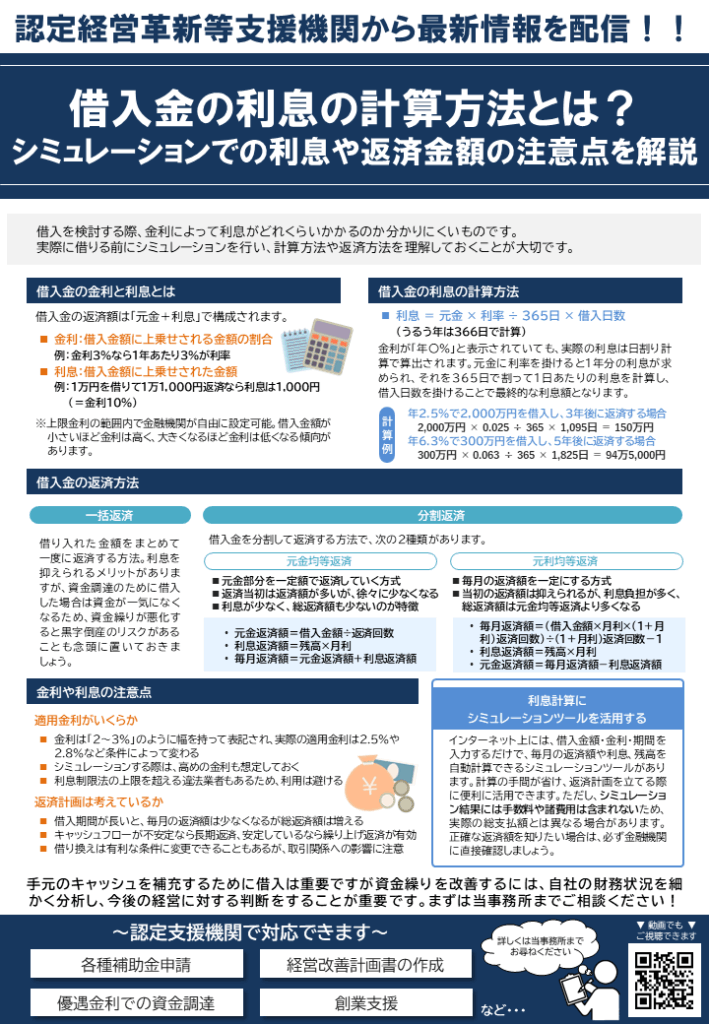 借入れをする際は、借入期間(短期か長期か)、信用保証協会の保証枠を使うか否か、キャッシュフローと返済額のバランスなど、利率以外に様々な検討が必要です。慎重に検討しましょう。